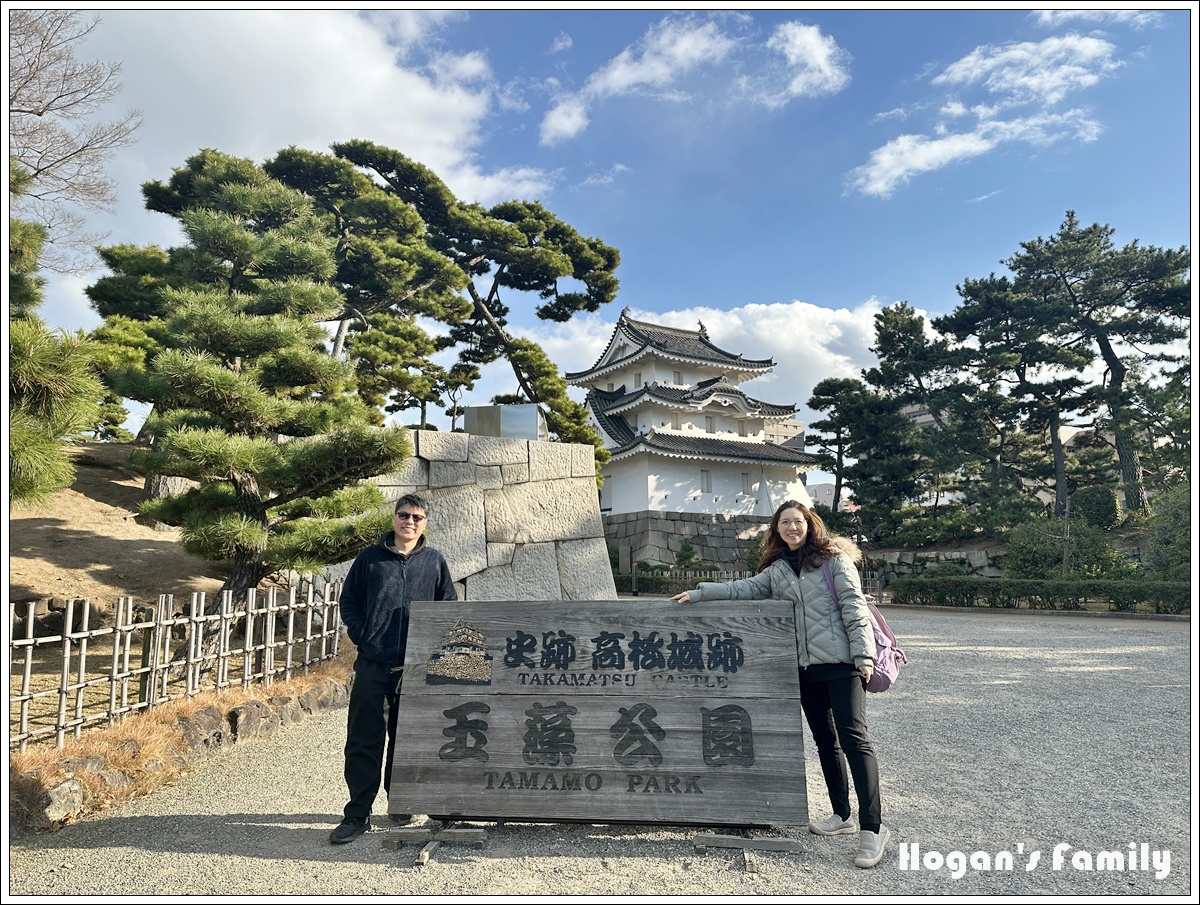 在公園的標誌牌前,我們留下了到此一遊的合影,背景是高松城的城樓和蒼勁的松樹,這張照片記錄了我們到訪高松城玉藻公園的美好時刻。