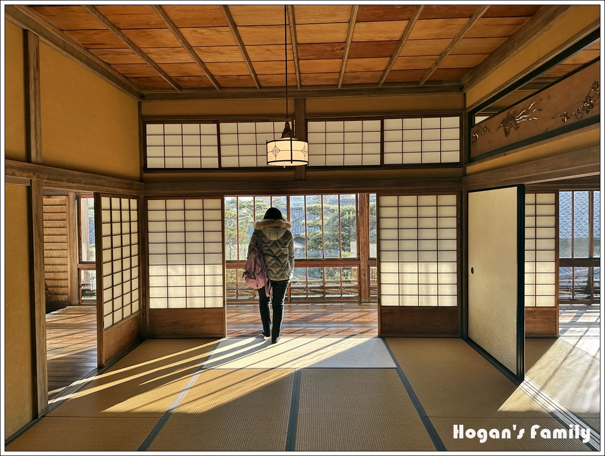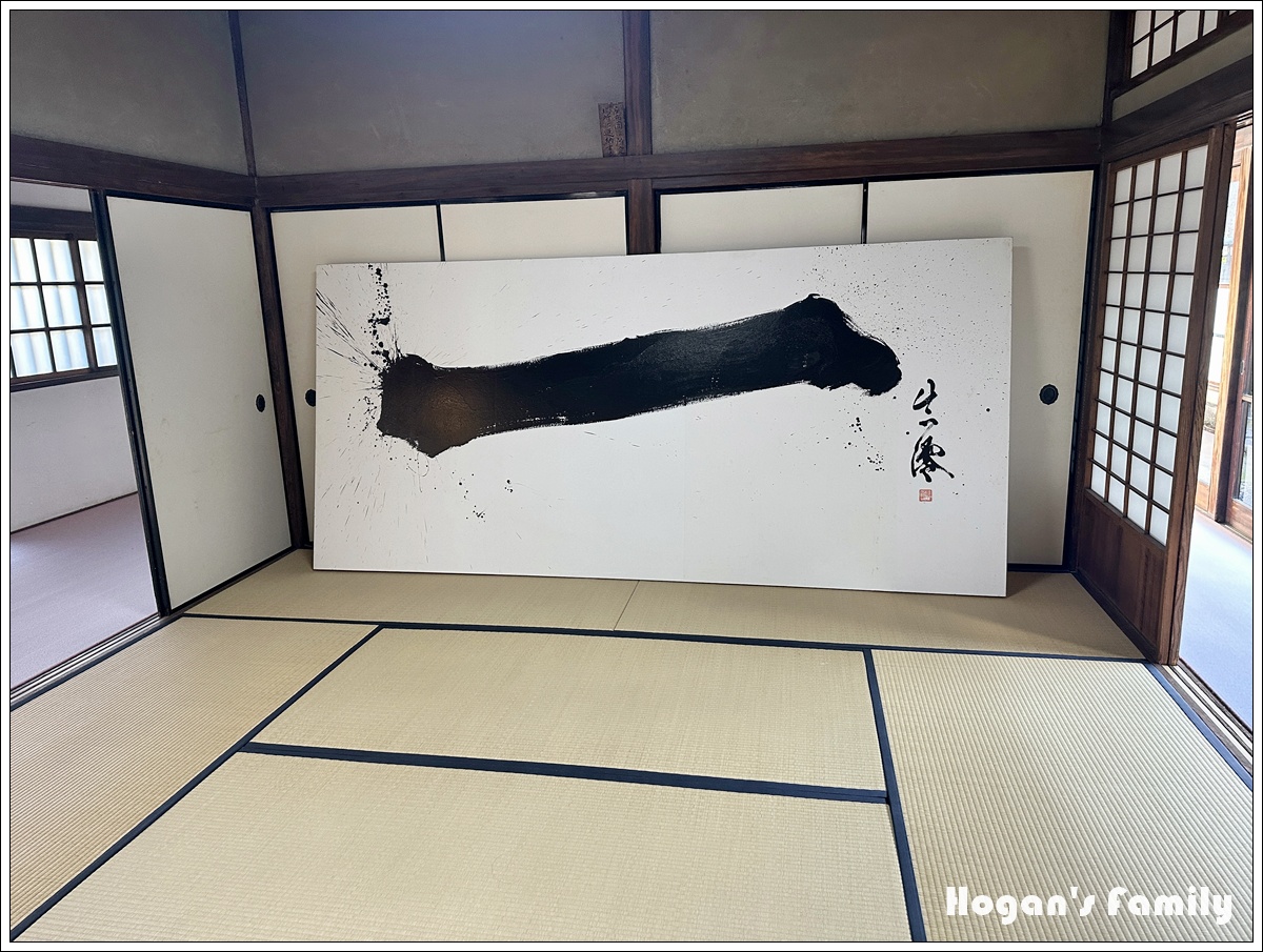 步入園區內的披雲閣,這座曾是藩主迎賓館的建築,散發著典雅的氣息,屋內簡潔的日式房間,掛著一幅氣勢磅礴的巨大「一」字墨寶。
