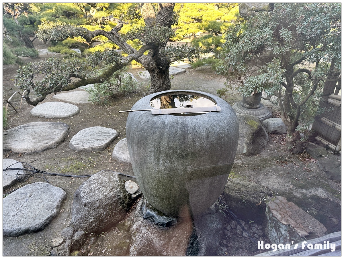 在披雲閣外的庭園中,巨大的石缸清澈的水面如鏡,讓人感受到日式庭園獨有的禪意與精巧。