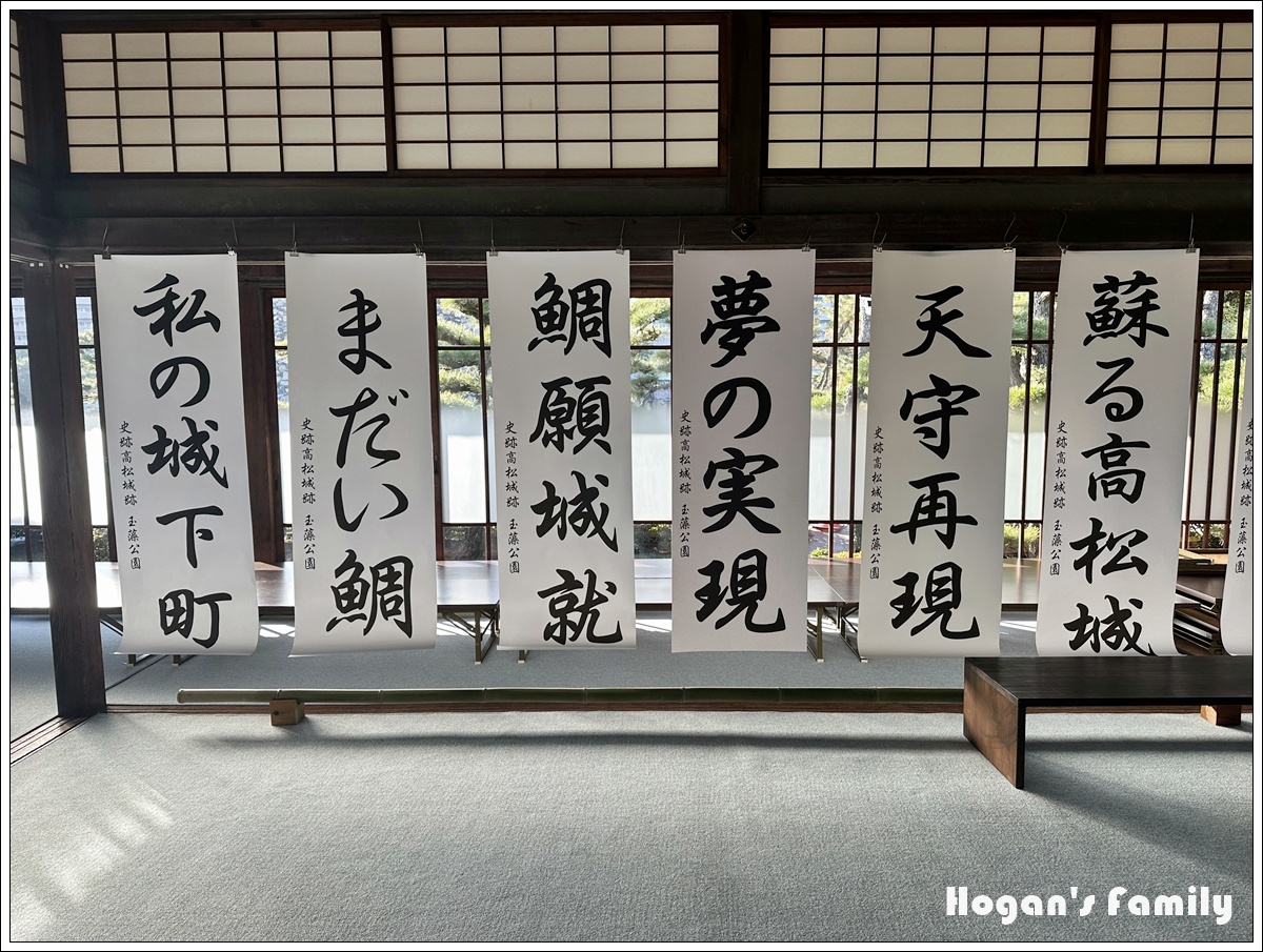 披雲閣內一排排白色布條上,以毛筆字寫著「夢の実現」、「天守再現」、「鯛願城就」等詞句,這不僅展現了當地對於重建天守閣的期盼,也傳達了高松城與地方文化(如餵食鯛魚祈福)的緊密連結。