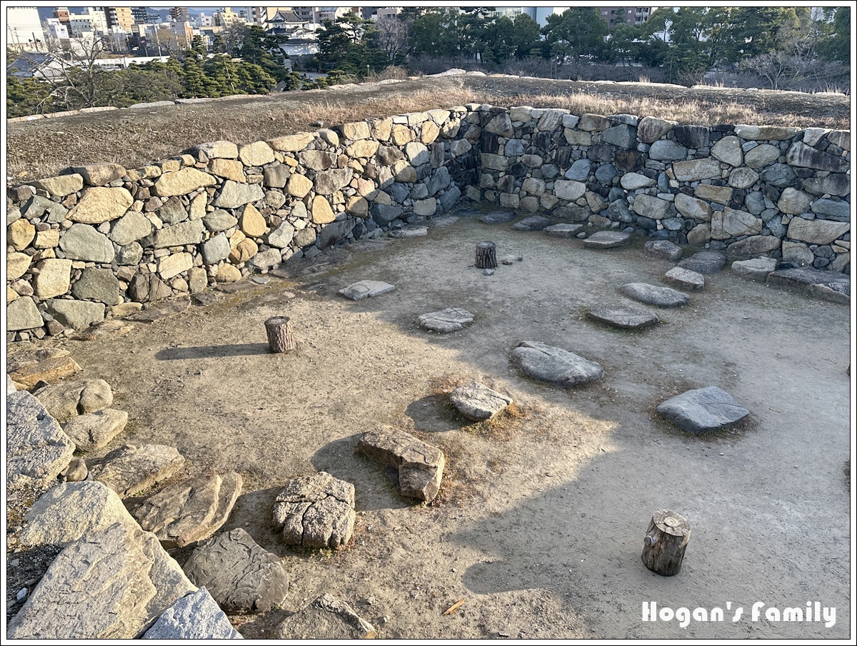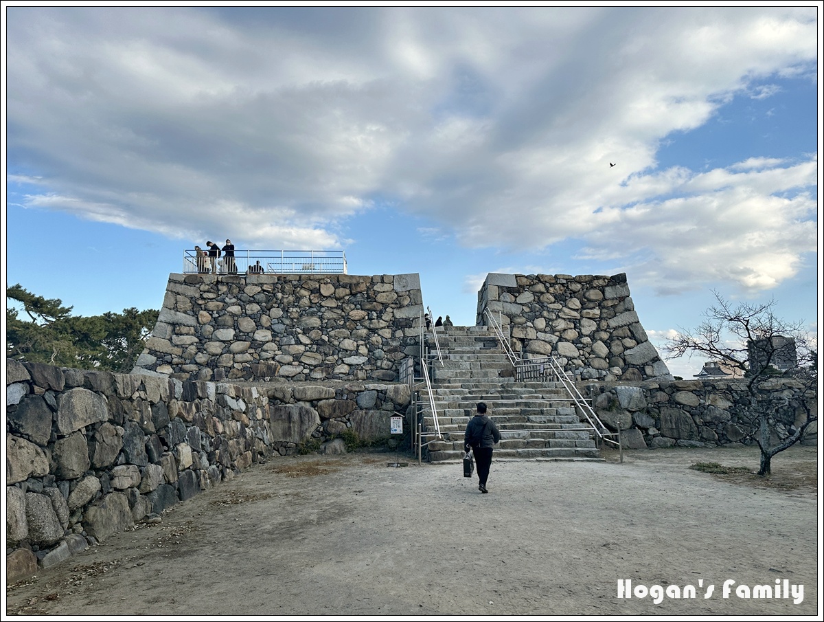 仰視天守閣遺留的石垣,有階梯通向頂部,想像昔日防禦工事的堅固與宏偉,這裡視野可以俯瞰整個公園和遠方的城市。