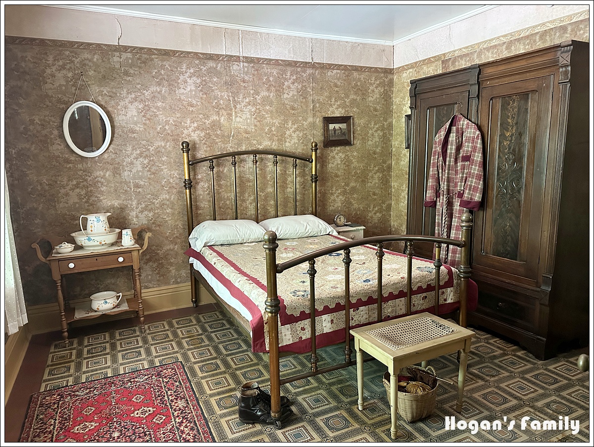 我們走進了這間木屋內,裡頭房間裡的陳設簡樸而溫馨,一張復古的鐵藝床架,牆上的圓鏡和一幅小小的畫作,以及角落裡古樸的衣櫥,無一不細緻地還原了當時人們的生活面貌。