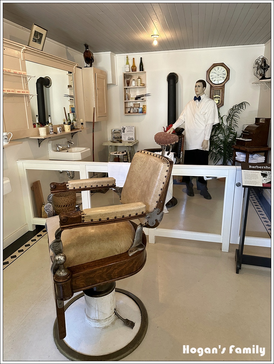 最有趣的是理髮店,一張老式理髮椅擺在中央,鏡子前一個栩栩如生的假人模特身穿白色制服,手持剃刀彷彿隨時準備為客人服務。
