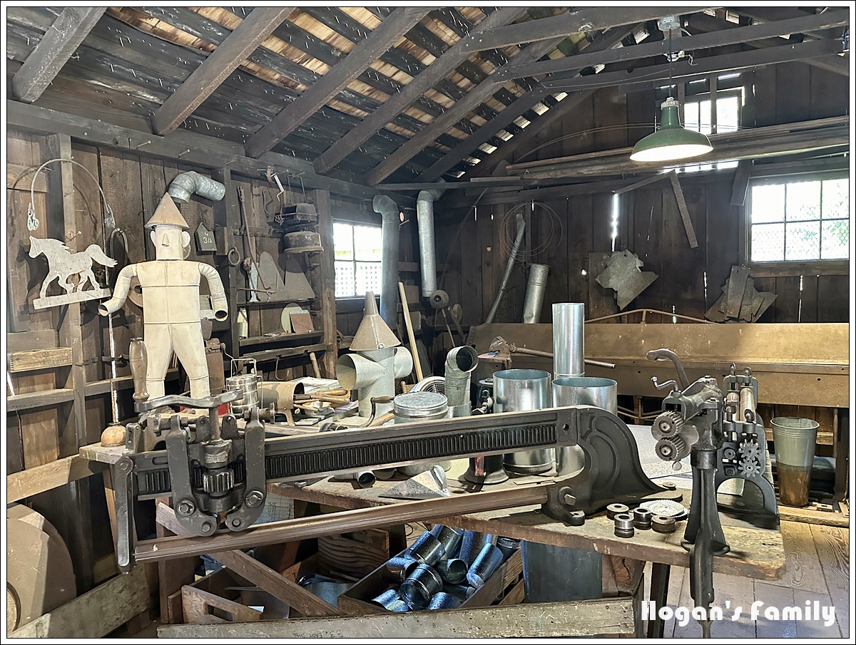 裡頭近距離地展示了工作台上那些用於加工金屬的機器和半成品,以及牆上掛著的動物造型鐵藝品,都生動地展現了當年鐵匠們精湛的手藝和他們創造的豐富生活用具。