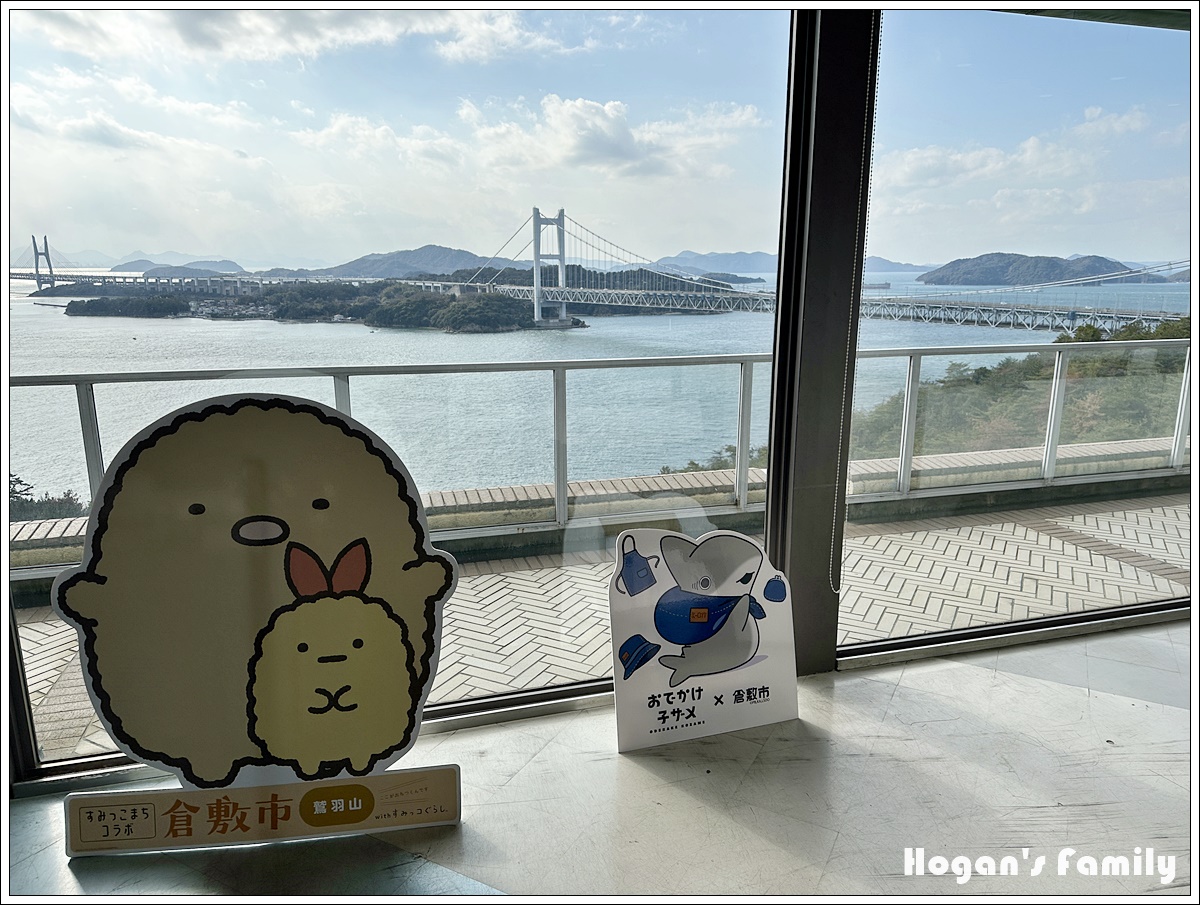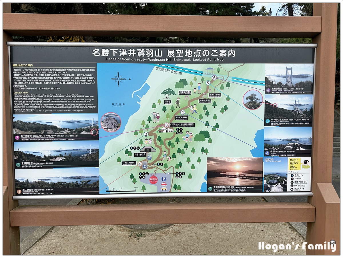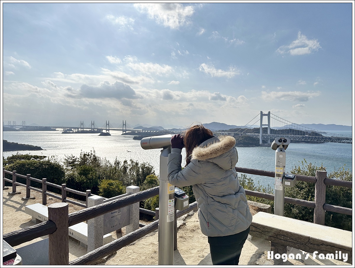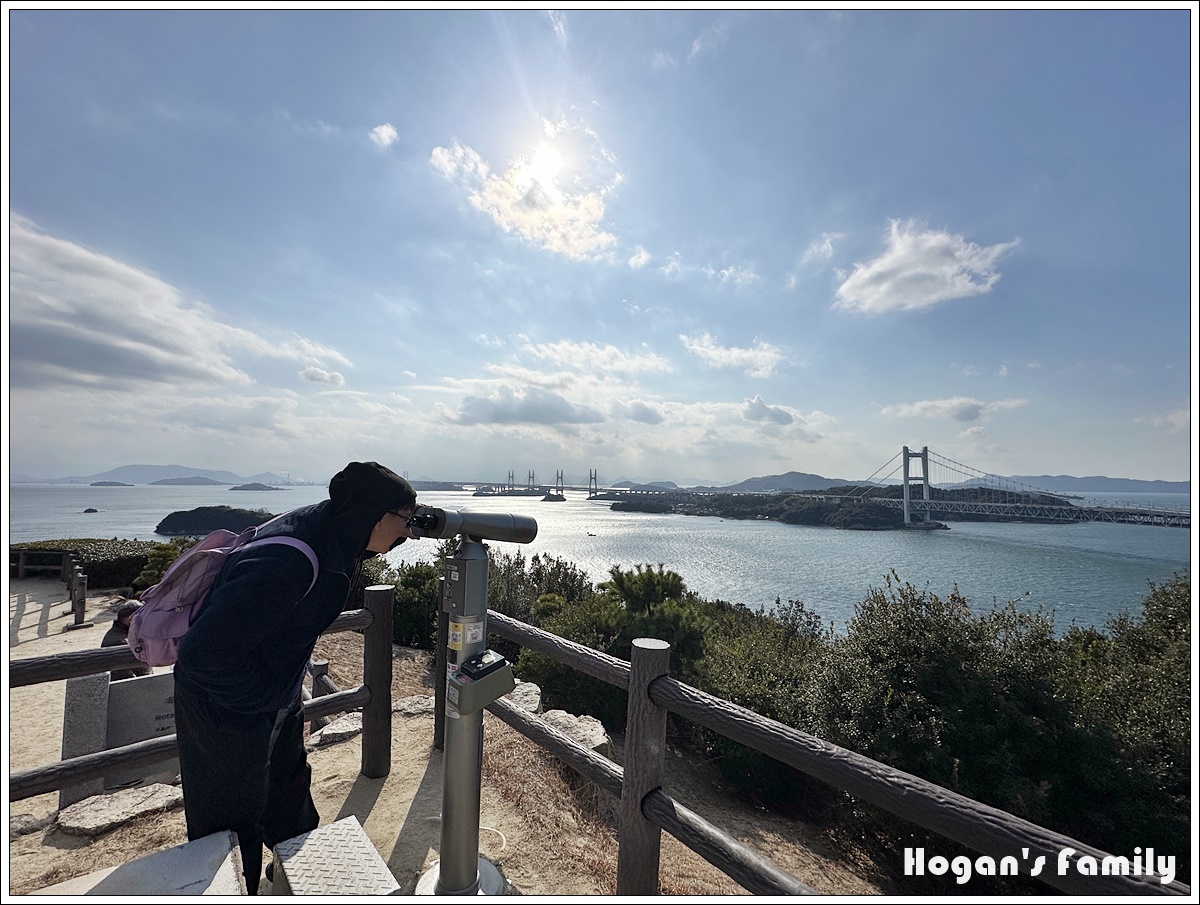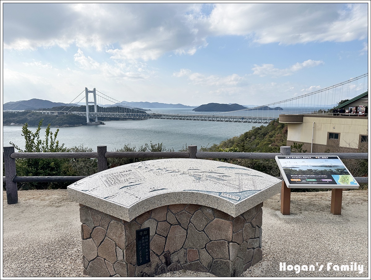 登上展望台,眼前的畫面令人讚嘆,遠方的瀨戶大橋宛如銀龍橫跨島嶼之間,前方還有地圖展示台,讓遊客瞭解所見美景的各個島嶼名稱。