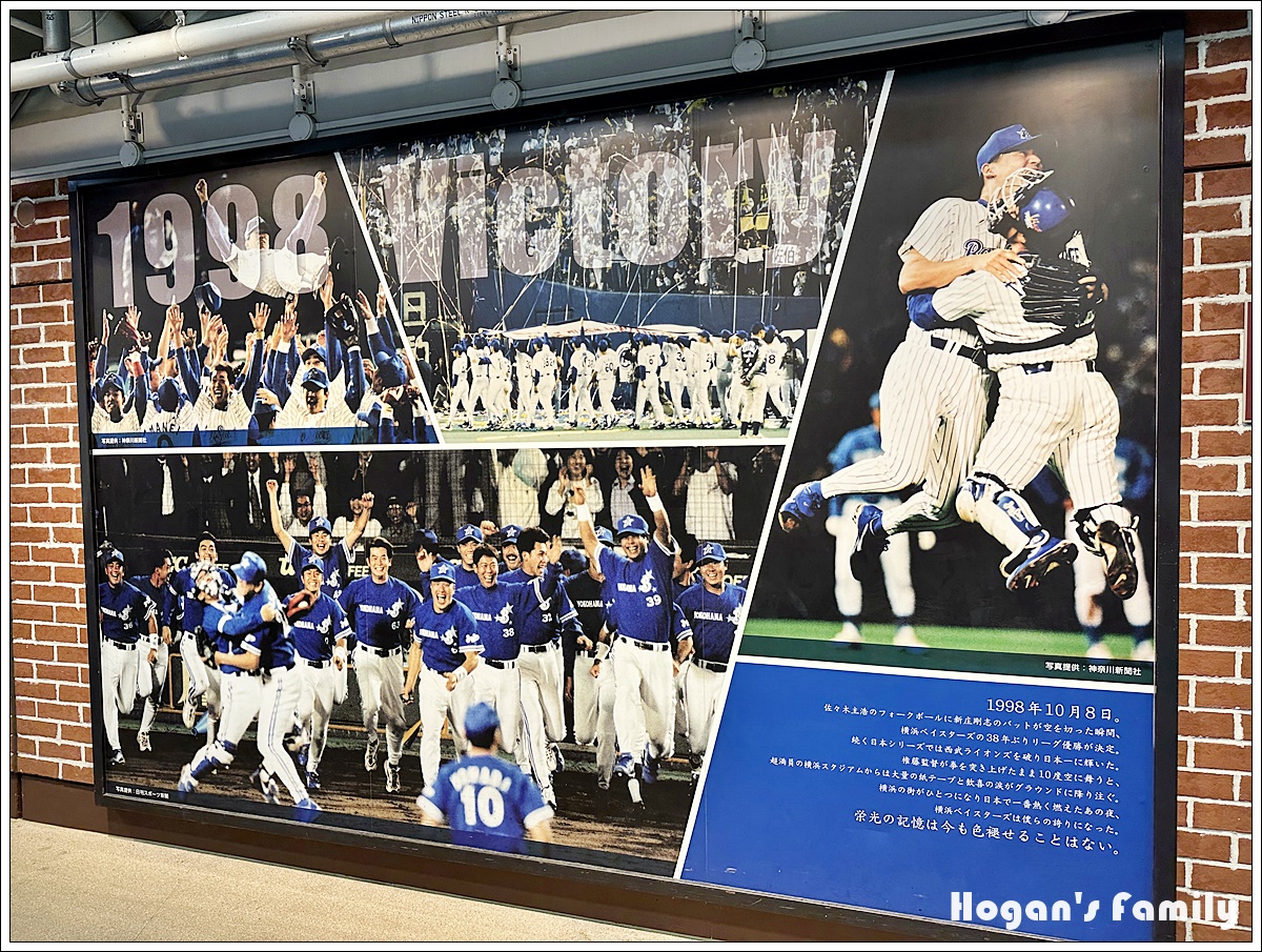 在球場內,這張海報紀念了1998年橫濱隊奪冠的歷史時刻,上面寫著「1998 Victory」,看著球員們在場上歡慶勝利的畫面,彷彿能感受到那份跨越時代的感動與榮耀。